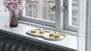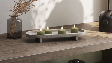 For et roligt helhedsindtryk kan du samle lysene på et fad og variere højderne, mens farverne holdes i samme palette.